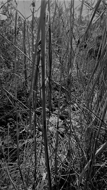 Il en est de même avec les deux autres grands reliefs, l'un figurant un labour au devant duquel vient se placer le bas de la jambe et la chaussure de l'artiste, comme s'il s'apprêtait à fouler la terre. J'ai vu dans le troisième, un champ de blé dont les épis formeraient de larges bandes striées de la verticale vers l'oblique. Devant cette troisième composition, le bâton de pèlerin et l'avant bras de Georges Guye sont placés de manière à suggérer un corps se déplaçant de gauche à droite dans le mouvement où l'appui vient se prendre en plantant le bâton un peu au devant de soi. La présence de l'être, aussi symbolique soit-elle, infléchit la perception plus abstraite que l'on pourrait avoir de ces grands formats.